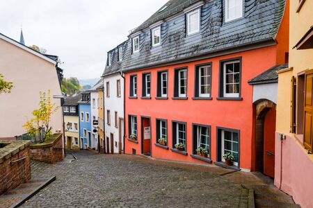 Street colorful houses in a street with cobblestones in the historic town of Saarburg, Germany. Not many tourists on the street on this cloudy day.