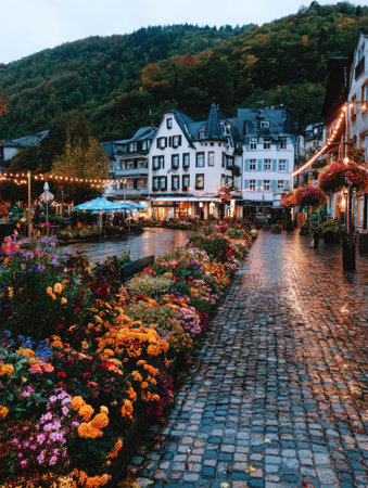 A view showcases a town square with vibrant flowers lining a cobblestone pathway. Buildings with traditional architecture are visible under dim lighting. The composition suggests an evening scene, with soft illumination and a focus on color and texture. Suitable for diverse commercial purposes including travel and design.