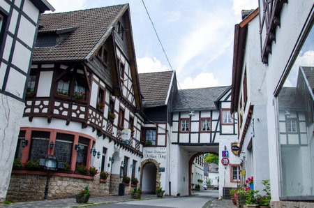 MONSCHAU, GERMANY - MAY 22nd 2019: Small picturesque town in the Eifel region in Noth Rhine-Westphalia. It is famous for its half-timbered houses and cobblestone streets
