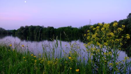 yellow wildflowers against the background of a quiet quiet narrow river and forest on the other Bank, background for the screen, screensavers, before sunrise