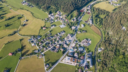 Aerial view of a village in the alpine mountains, Lofer, Austria.