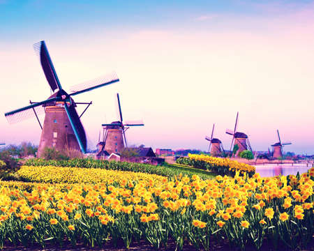 fabulous mystical, stunning magical spring landscape with daffodils on the background of a cloudy sky in Kinderdijk, Netherlands. Charming places. (Meditation, anti-stress, Harmony - concept)