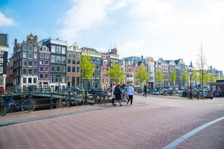 Amsterdam, Netherlands - April 20, 2017: Traditional dutch medieval buildings, beautiful architecture in Amsterdam