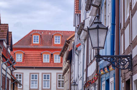 HANNOVER, GERMANY. JUNE 19, 2021. Beautiful view on small street. Buildings in fachwerk style, prussian wall.