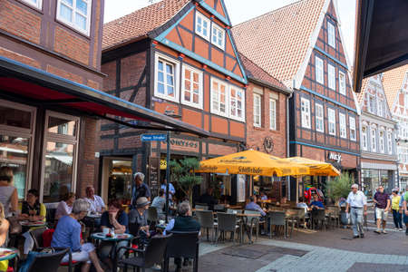 Hansestadt Stade, Germany - August 22, 2019: Shopping street with restaurants, shops and people around in Hansestadt Stade, Lower Saxony, Germany