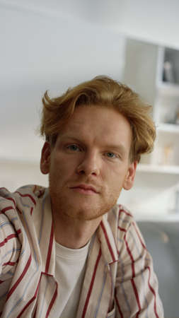 Serious guy looking webcam talking with friend closeup. Upset ginger man nodding listening to girlfriend at home. Successful businessman videocalling partner get frustrating news on weekend morning