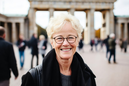 Group of happy friends standing in front of Brandenburg Gate in Berlin, Germany