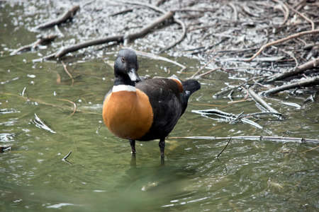 the Australian shelduck is wading in the water looking for food