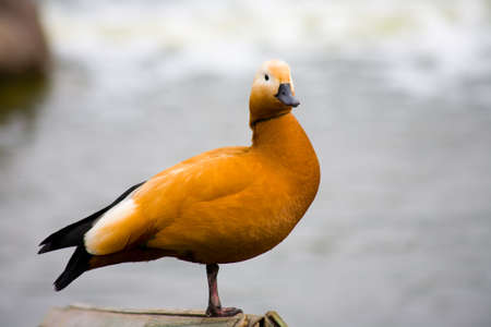 The ruddy shelduck standing on stump near pond. Red duck - latin name is Tadorna ferruginea.