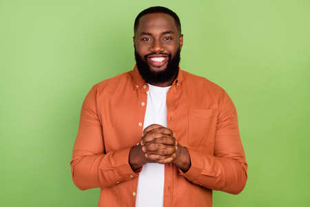 Photo of nice young brunet guy wear orange shirt isolated on green color background