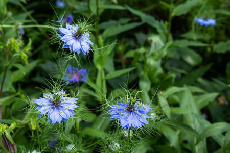 Beautiful blue nigella flowers blooming in the garden.