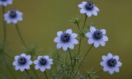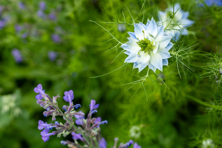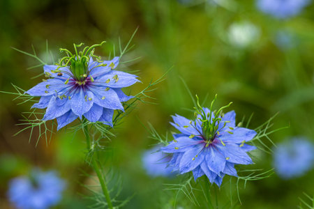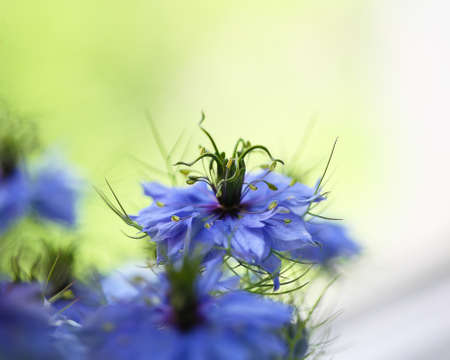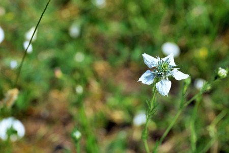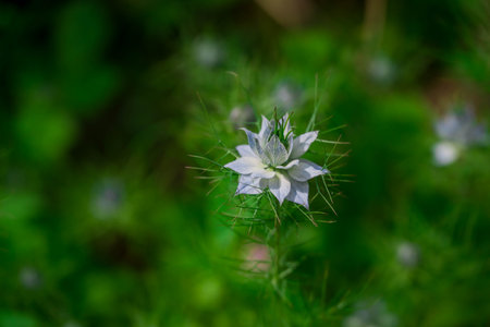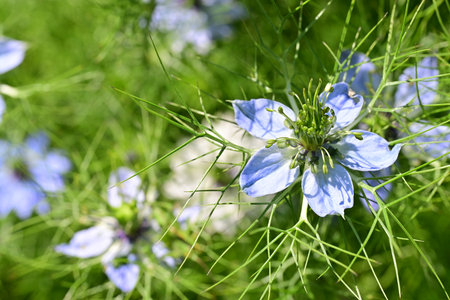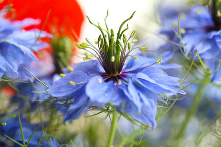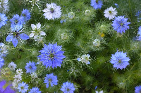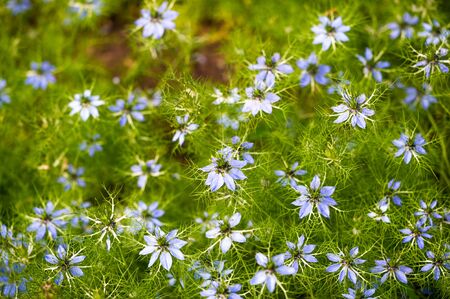 Nigella sativa - nature blue and white flowers, differential focus.