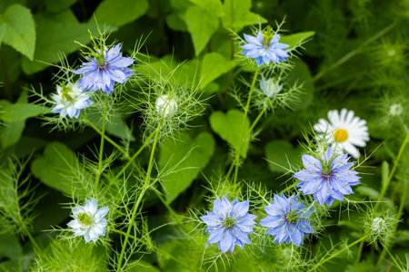 Nigella blossoms in a summer meadow