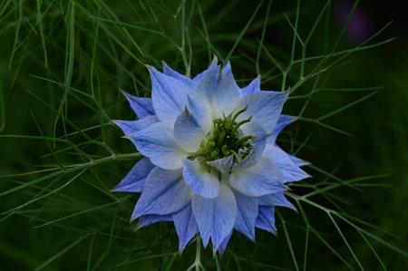 Closeup of a blue Love in a mist Nigella damascena flower