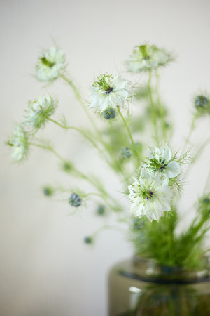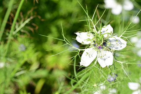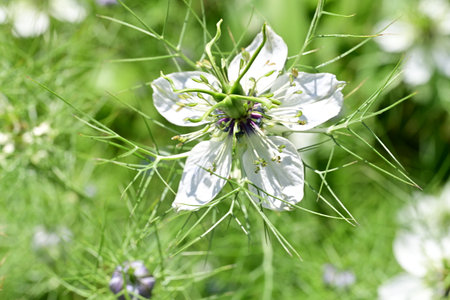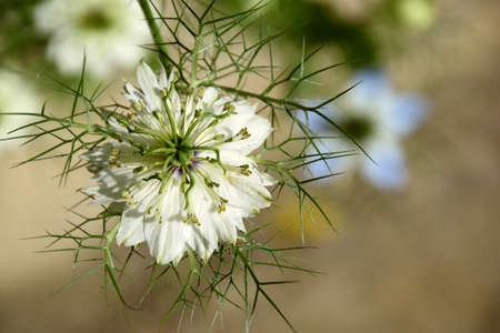 Delicate white nigella flower, common name Love in a Mist, growing in a rural garden