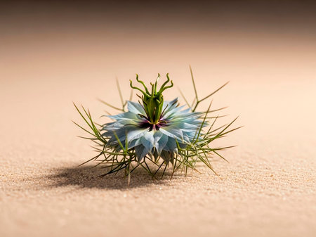 Nigella damascena flower on sand background, close up