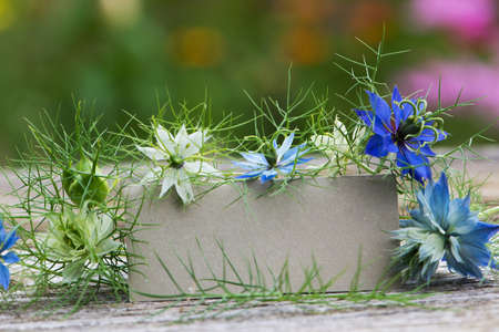 Photography of nigella flowers and buds on slate for message, announcements, cards or signs