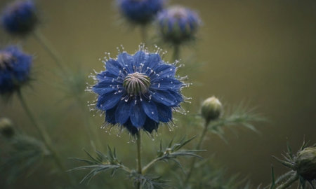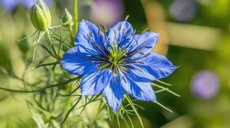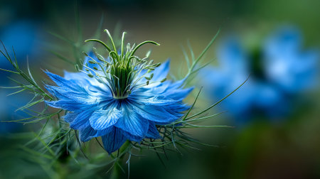 Captivating blue Nigella flower head in a natural outdoor setting