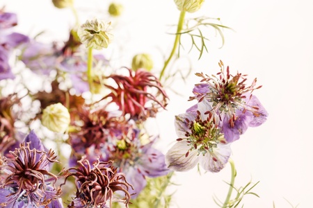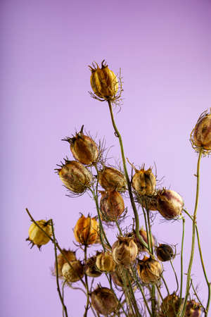 dried flowers. Bouquet for the interior. Nigella. Lilac background.