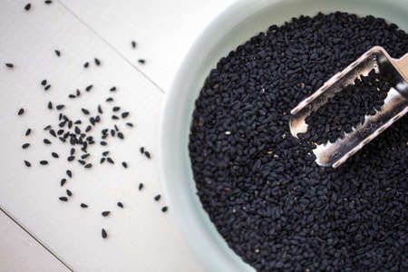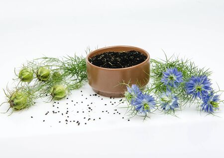 black cumin in bowl on white background
