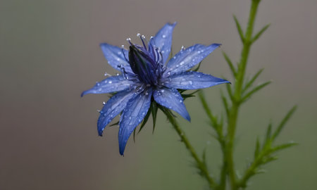 Beautiful blue flower with drops of dew on the petals