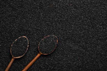 Wooden spoons on pile of black sesame seeds, flat lay. Space for text