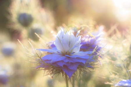 Nigella damascena flower in the field at sunset.