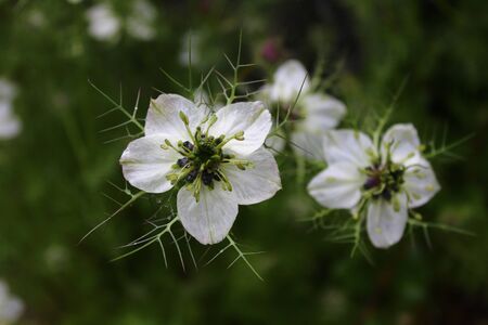 Top view of some fully bloomed Nigella sativa, also called Black Cumin or Kalonji, with star shaped white petals and black seeds, medicinal plant