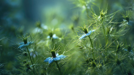 The Nigella in spring, fresh green leaves, soft sunlight filtering, vibrant atmosphere full of vitality, natural textures, serene mood.
