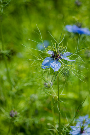 Nigella sativa flower with blue flowers (Love-in-a-mist), summer herb plant with different shades of blue flowers on small green shrub. Medicinal plant black caraway, black cumin, garden background.