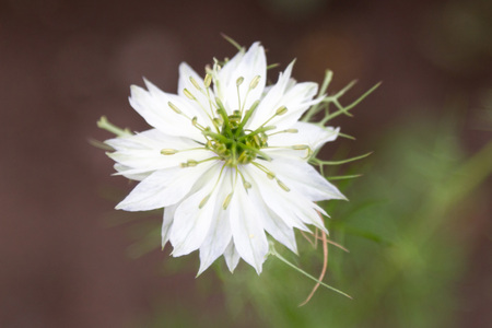 Delicate white nigella flower, common name Love in a Mist, growing in a rural garden