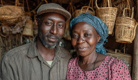 Smiling African American couple in a market, surrounded by handmade woven baskets, highlighting their craftsmanship and connection to local culture and community