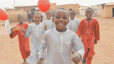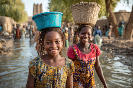 Two joyful girls with baskets on their heads walk through a river, surrounded by a lively community, capturing the essence of daily life and cultural vibrancy