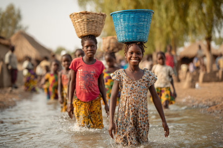 Young African girls are walking through shallow water, carrying vibrant baskets on their heads, highlighting cultural practices and community engagement in a rural environment