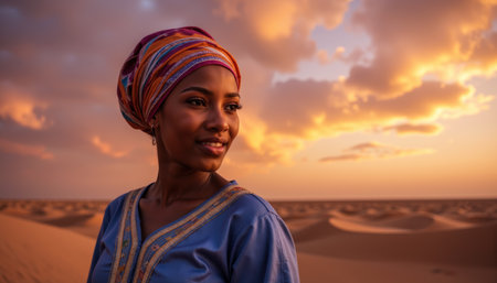A woman, likely from Africa, wearing a vibrant headscarf and blue garment, stands in a desert landscape at sunset.