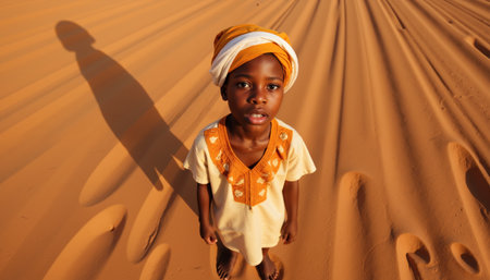 A young boy from a desert region, wearing a traditional head wrap and embroidered tunic, stands amidst towering sand dunes.