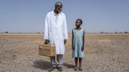 A poignant scene depicting a doctor and a child on cracked soil in a barren landscape, symbolizing the challenges of health and education in impoverished regions.