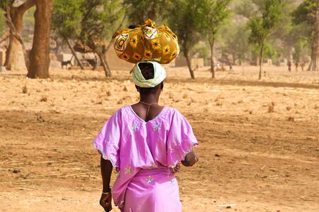 SANKANDI, GAMBIA- JAN 6, 2014: Once a month the doctor comes to town. Young woman with babies dress up for the occasion and walk together to have the monthly health checkup