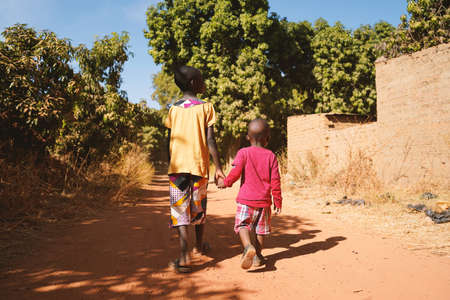 Mali, Africa - circa August 2009 - Black african friends embracing each other while looking at camera living in a rural area near Bamako