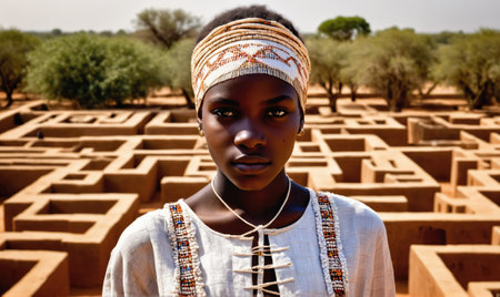 A young girl stands in front of a mudbrick maze in Burkina Faso