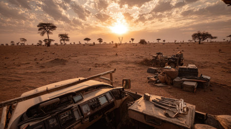 An image captures a desert scene at sunset, featuring an abandoned vehicle and the remnants of its contents. The warm light bathes the arid landscape, highlighting the sand and sparse vegetation. The composition emphasizes the contrast between the natural environment and human presence, possibly suitable for editorial or commercial projects.