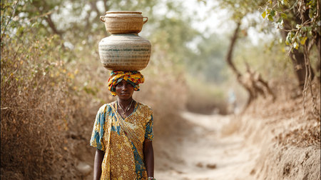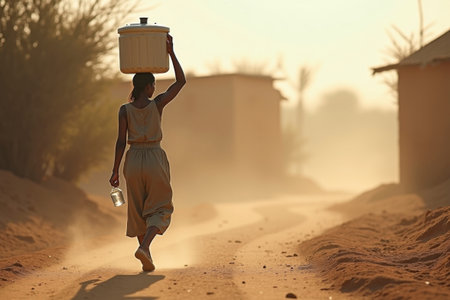 A woman carries a large water container on her head through a dusty, arid landscape toward a village. The image highlights the effort and necessity of walking long distances in water-scarce regions to secure access to drinking water.