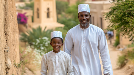 Generative AI Image of African Father and Son in Islamic Mosque with Trees