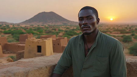 Generative AI Image of Black African Man with Ancient Building and Mountain View at Sunset