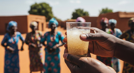 A person is holding a glass of Zoom-koom, a traditional millet flour drink from Burkina Faso, with women in the village behind.