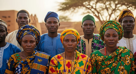 A dignified and proud group of African men and women pose for a portrait in their vibrant, traditional attire. Their direct gaze and colorful clothing celebrate their rich cultural heritage, community, and identity.
