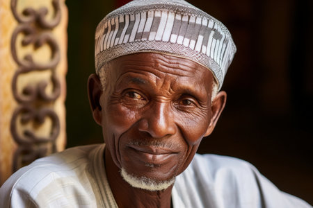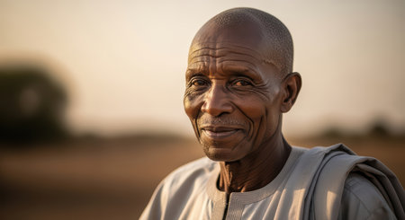 Close up outdoor portrait of a wise and thoughtful elderly African man wearing a traditional hat, with the warm light of sunset on his face.