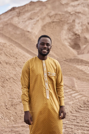 Vertical portrait of Black young man wearing traditional kaftan dress walking towards camera in desert