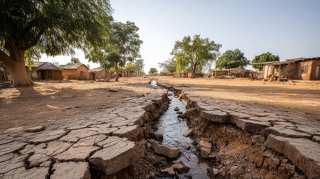 Broken water pipeline in a sun-baked village. Water crisis and water shortage in summer during long drought is a global problem of drought on the planet