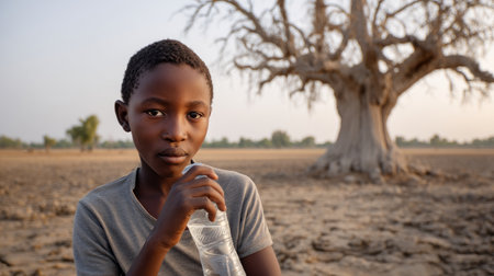 A young African boy in a withered field in front of a withered tree drinks water from a bottle. Water crisis and water shortage in summer during long drought is a global problem of drought on the planet